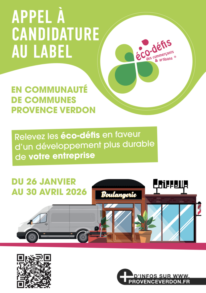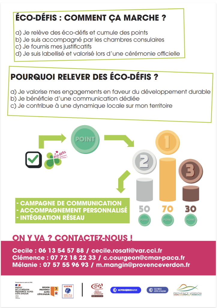 Artisans et commerçants du territoire Provence Verdon, la Communauté de communes Provence Verdon (CCPV), en partenariat avec la Chambre de Métiers et de l’Artisanat Provence-Alpes-Côte d’Azur (CMA PACA) et la Chambre de Commerce et d’Industrie du Var (CCI du Var), lance le label Éco-défis.