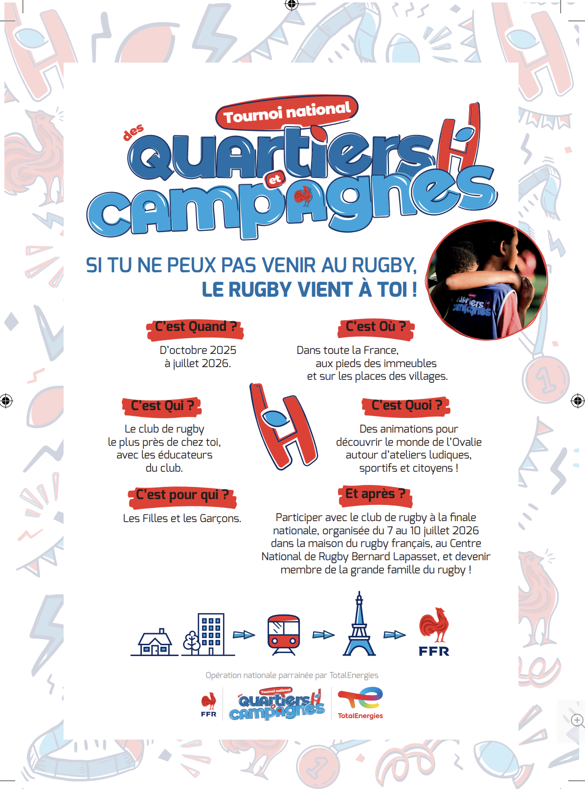 Dans le cadre du Tournoi national des Quartiers & Campagnes, le club de rugby le plus proche vous propose des ateliers ludiques, sportifs et citoyens — directement aux pieds des immeubles et sur les places de village.